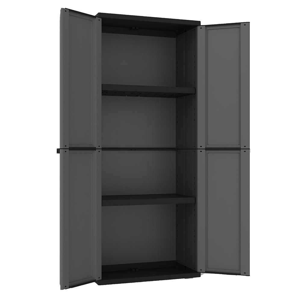 Gabinete j-base 268, feito em polipropileno. cor cinzento escuro, 2 prateleiras ajustáveis em altura, possibilidade de fechamento com cadeado. 68 x 37,5 x 163,5 cm