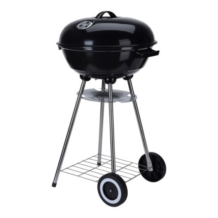 Churrasqueira com tampa preta, resistência a altas temperaturas, revestimento a pó. tampa ø370 x 0,4 mm, fogão ø 360 x 0,7 mm, com bandeja interna de carvão zinco 225 x 0,7 mm, altura do fogão 255 ????mm, grelha de cozimento cromada ø340 mm, espessura do fio 2,5/3,5 mm, pé plano em tubo metálico. 3 clips revestidos a silicone preto, 2 ventilações