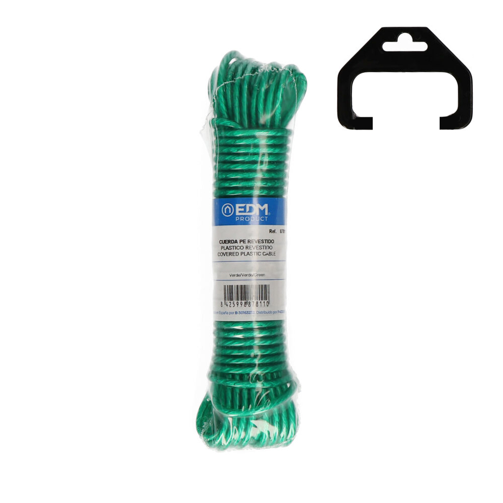 Corda plastico revestido 25 m verde. composição: mono filamento de polietileno torcido 3 cabos. recoberto de pvc. caracteristicas: suave, flexivel, boa resistência, pouca elasticidade. facil limpeza, utilidades: estendais exteriores e interiores, camping, nautica, cercados, agricultura, industria em geral, bricolagem