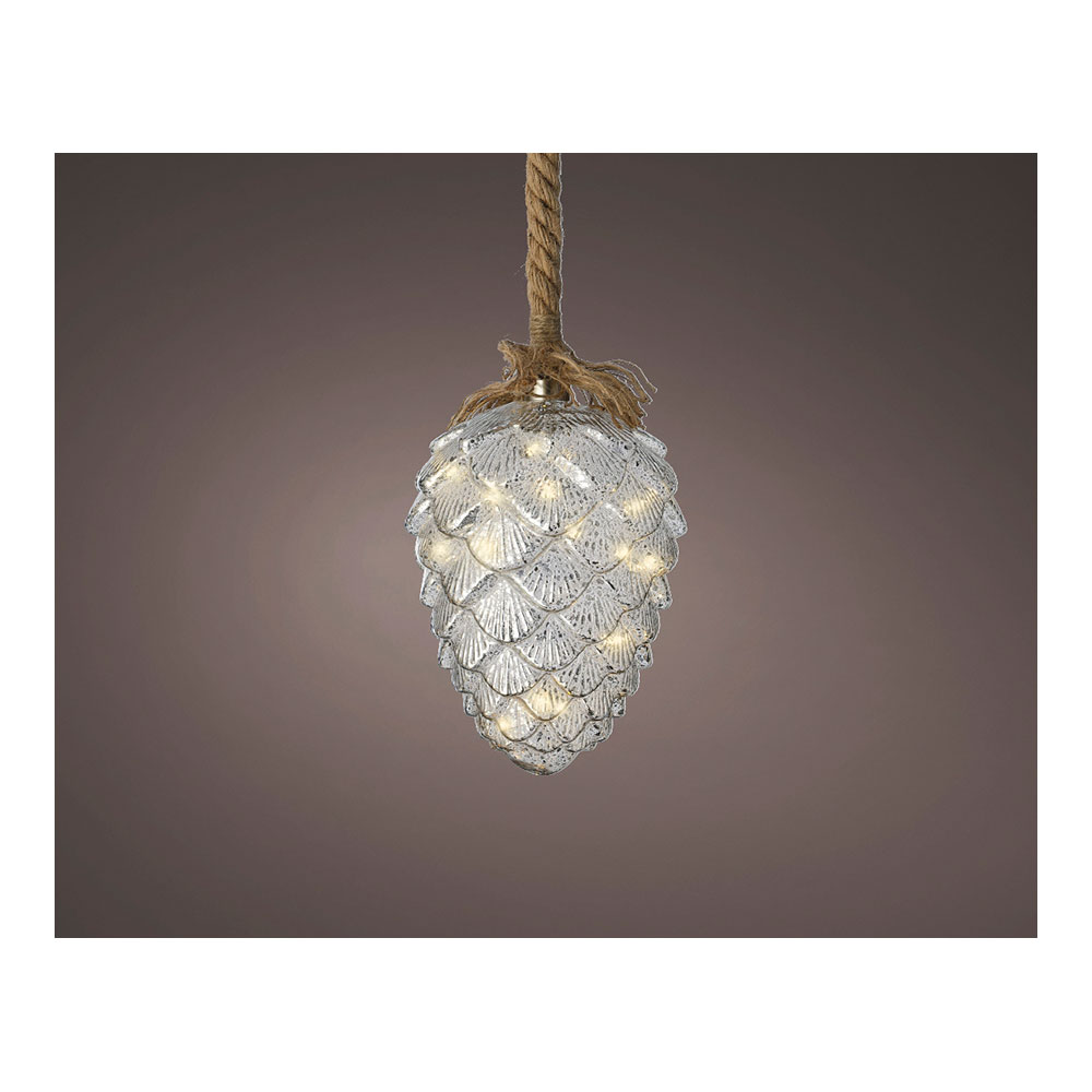 Enfeite microled pinha para pendurar, para interior, luz fixa, 15 leds, ø15cm. branco quente, 3 pilhas aa (não incluídas), cabo de alimentação 1m de juta, pinha de vidro. autonomia aprox. 75h. lumineo