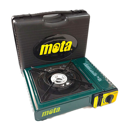 Fogão a gás portátil para uso externo. compatível com gás: cartucho de butano tipo msf-1a en417. com saída externa de propano g-31/butano g-30. potência de 2,3 kw. sensor de pressão e dispositivo de segurança para ajuste do cartucho. regulador de chama variável. fácil de limpar: bandeja de pingadeiras esmaltada removível. inclui estojo de transporte. cor: verde