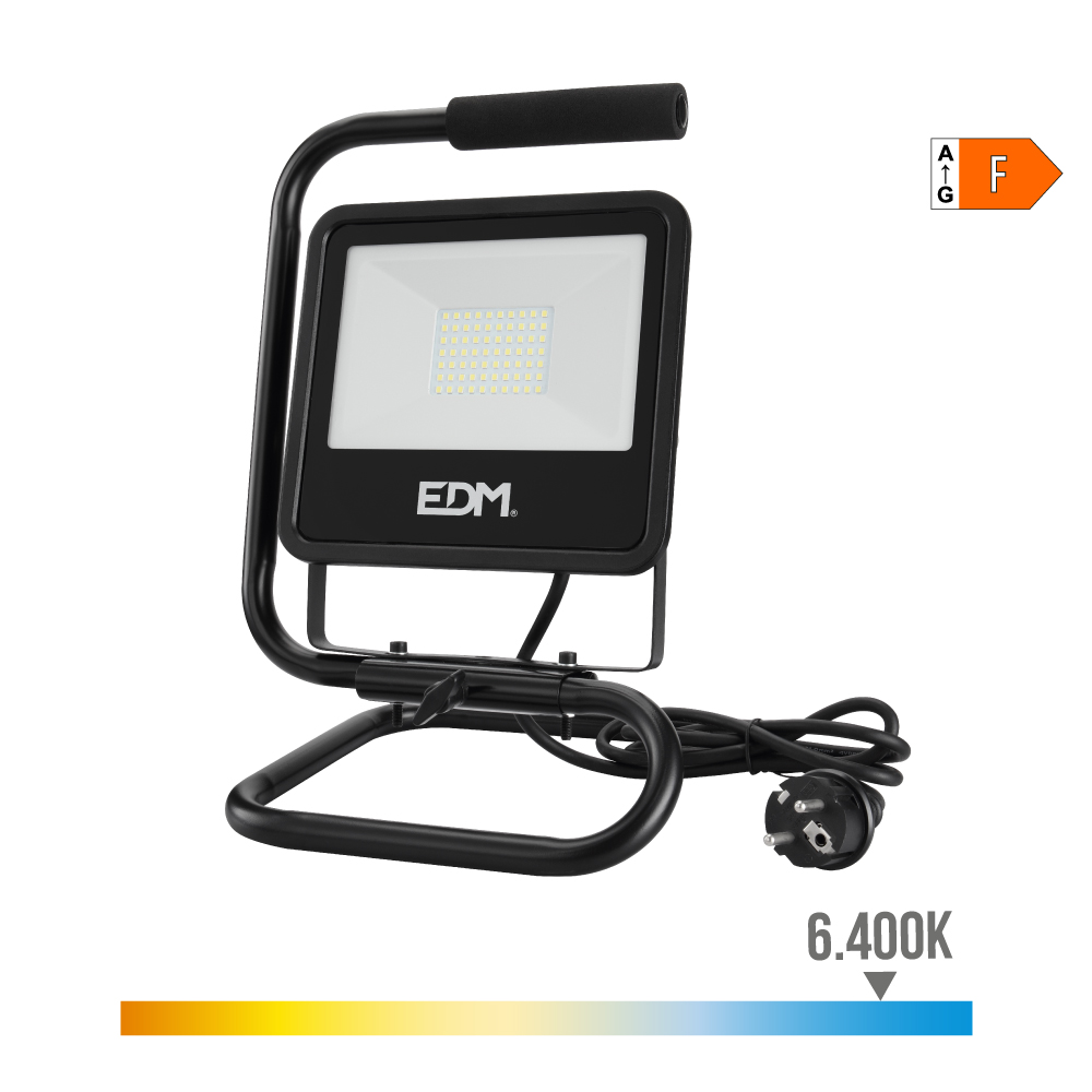 Projetor led com pé 50w 4000lm 6400k black series edm. ip65 24x21x34cm 25000h 220-240v 50hz classe f 120° inclui ficha schuko 1,5m black series edm