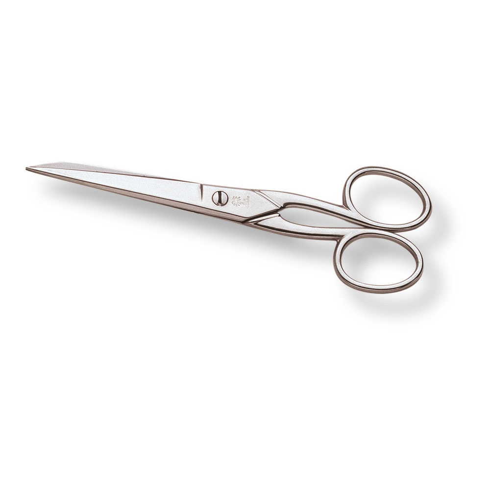 Tesoura de costura europa 5-½”/139,7mm 08221220 palmera. aço de carbono de altas prestações estampada. dureza das lâminas 50-54 hrc. lâmina reta e aneis normais. acabamento niquelado. montagem com parafuso para ajustar a precisão