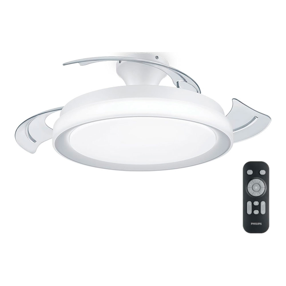 Ventoinha de teto de led modelo bliss. cor branco potência: 28 + 35 w com a possibilidade de mudar o tom da luz 2700 k- 4000 k- 5500 k pás abatíveis. comando. ø106 cm 42,5 db 230 rpm